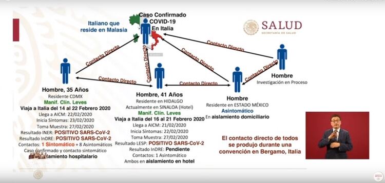 El funcionario mencionó la existencia de otro hombre en Sinaloa, quien también resultó con un primer resultado positivo al COVID 19. Éste estuvo en contacto con el primer paciente y con el hombre infectado de origen italiano pero con residencia en Malasia.