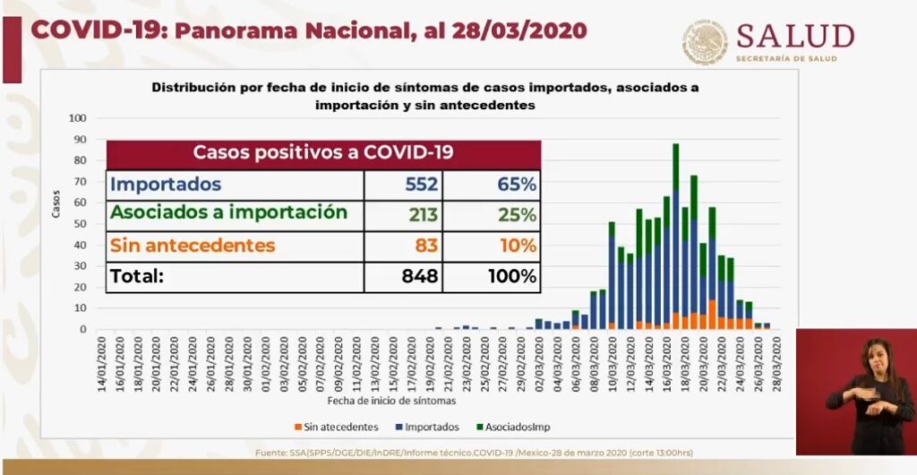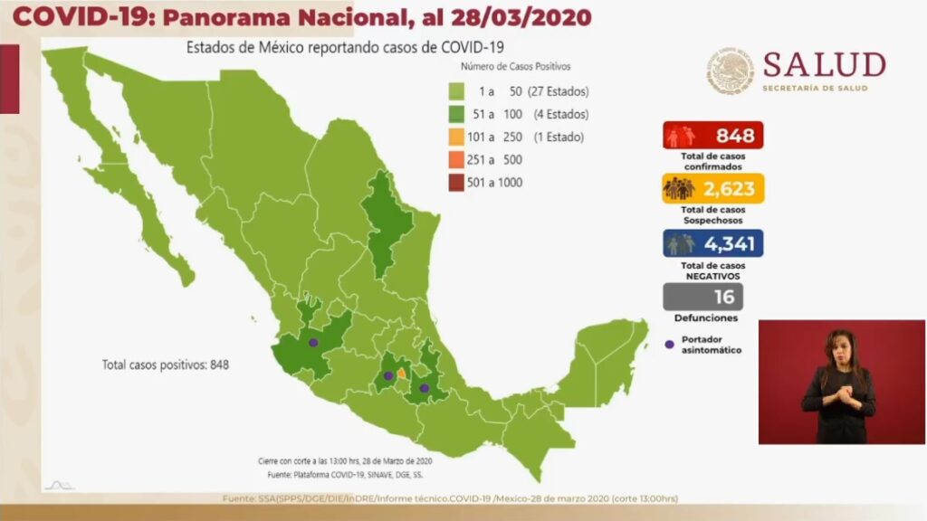Este sábado suman 848 casos de coronavirus en México, y van 16 muertos en el país.