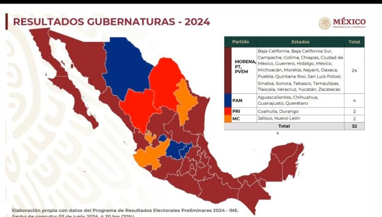 Desde 2018, el avance de Morena en las entidades del país no ha cesado y la elección de este 2 de junio lo confirma al conservar su mandato, en coalición con otros partidos, en 21 de 32 estados: Baja California (Marina del Pilar Ávila), Baja California Sur (Víctor Manuel Castro), Campeche (Layda Sansores), Ciudad de México (Martí Batres), Colima ( Indira Vizcaíno), Chiapas (Rutilio Escandón), Guerrero (Evelyn Salgado), Hidalgo (Julio Menchaca), Estado de México (Delfina Gómez), Michoacán (Alfredo Ramírez Bedolla), Nayarit (Miguel Ángel Navarro), Oaxaca (Salomón Jara), Puebla (Sergio Salomón Céspedes), Quintana Roo (María Lezama), Sinaloa (Rubén Rocha Moya), Sonora (Alfonso Durazo), Tabasco (Carlos Manuel Merino), Tamaulipas (Américo Villarreal), Tlaxcala (Lorena Cuéllar), Veracruz (Cuitláhuac García) y Zacatecas (David Monreal).