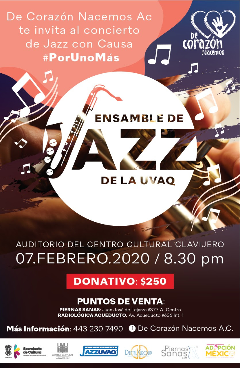 Con el fin de promover la adopción de niñas y niños, el Ensamble JazzUVAQ tendrá un concierto en el auditorio del Centro Cultural Clavijero, el próximo 7 de febrero, a las 8:30 de la noche; el donativo será de 250 pesos en la entrada. Danie...